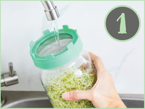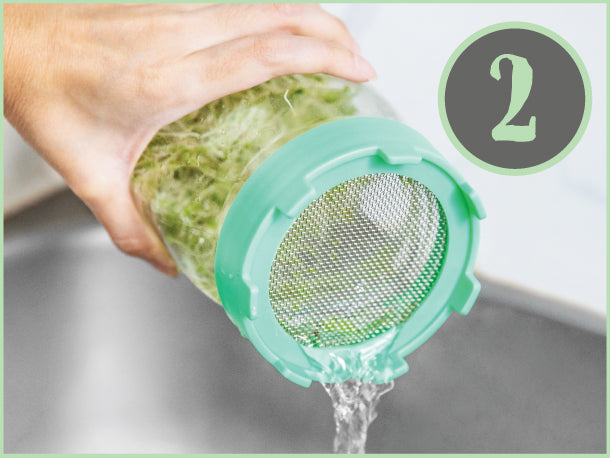 Rinse by filling the jar with water, swirling it around, & then pouring the water out through the sprouting lid.